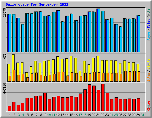 | Day | Hits | Files | Pages | Visits | Sites | KBytes | ||||||